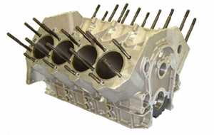 Aluminum Block Chevy bore spacing 4.840, Chrysler, Olds, Chevrolet bell housing pattern. .250 raised cam, 9.800 10.200 or 11.700 deck height option, cross bolted mains. They will accommodate bores up to 4.625 & strokes up to 5.300