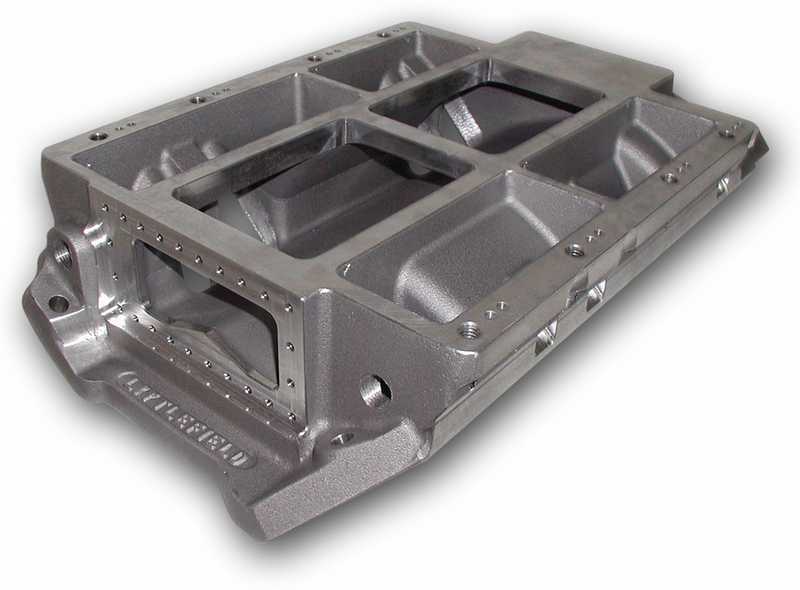 Royal ram blower manifold for Big Block Chevy, has provision for water, replaceable top plate, will accept 6-71 blower to 14-71 blower and machined for burst panel. Panel extra! Ask about optional valley cover option.