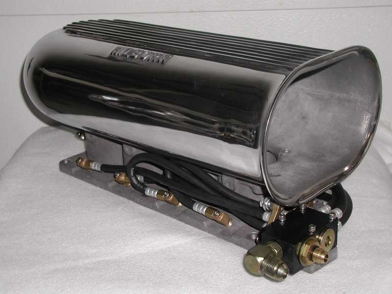Hilborn 4 port upright injector with polished scoop. Complete with all lines nozzels and jets ready to run alcohol or gas